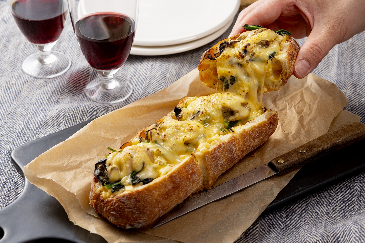 ★を合わせておく。バゲットに贅沢シュレッドチーズの半量を敷いて牡蠣とほうれん草を並べ、★を流し込む。